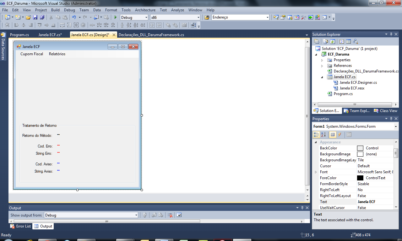 Mãos a obra! Vamos alterar um pouco o layout do nosso projeto, nomeei a Janela do meu Form1 para Janela ECF. Aproveitei e alterei o nome do Class1 para Declarações_DLL_DarumaFramework.